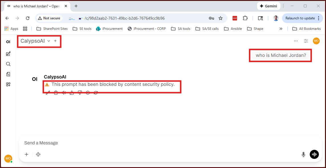 Now you should be able to return to the chat interface and send a prompt to CalypsoAI (F5 AI Guardrails).