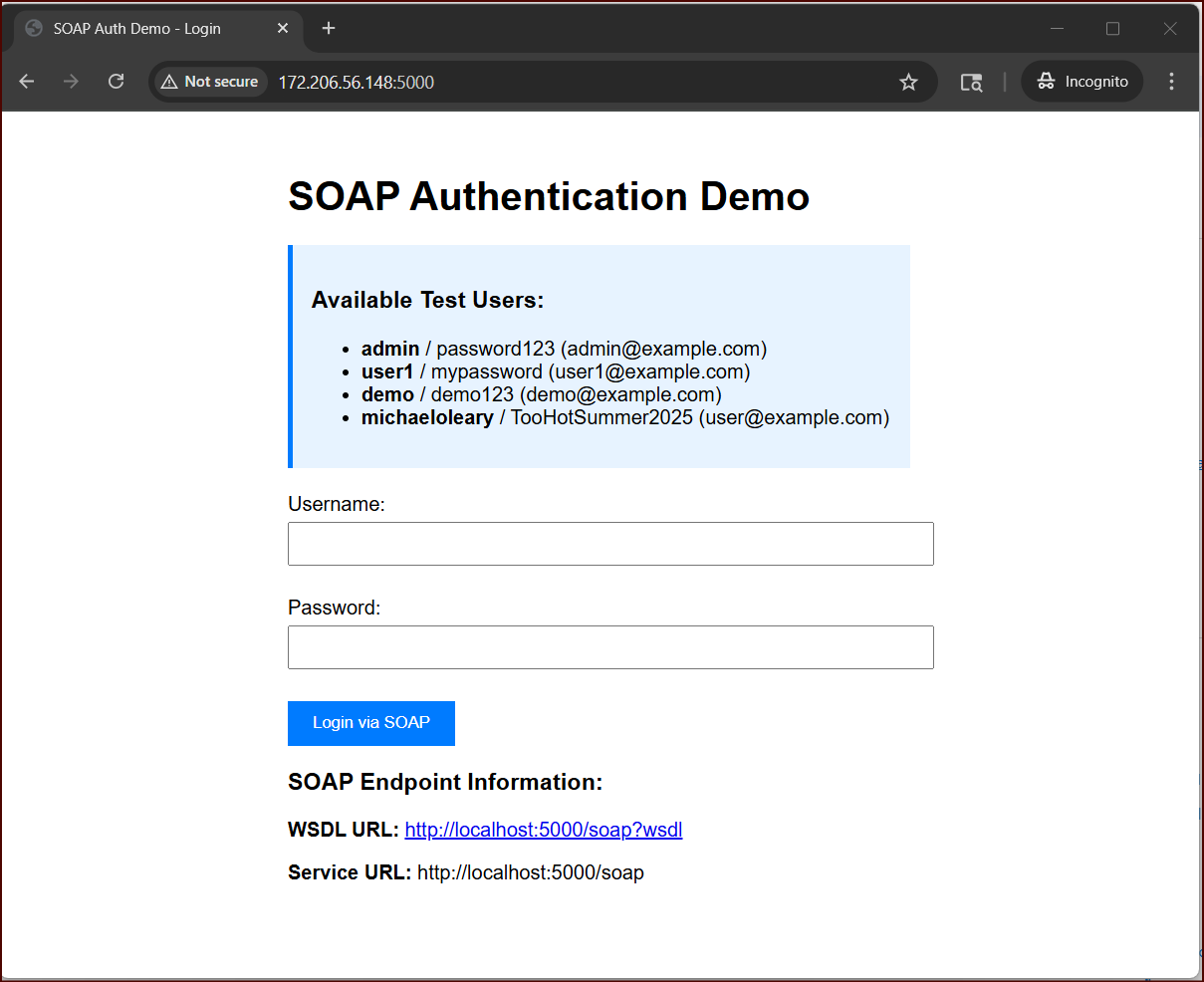This SOAP authentication demo application demonstrates how to build a realistic, production-like application that’s handy for F5 APM testing. The key design decisions - in-memory storage, comprehensive logging, separate logout page, and multiple API endpoints - make it both easy to deploy and rich in observable behavior.