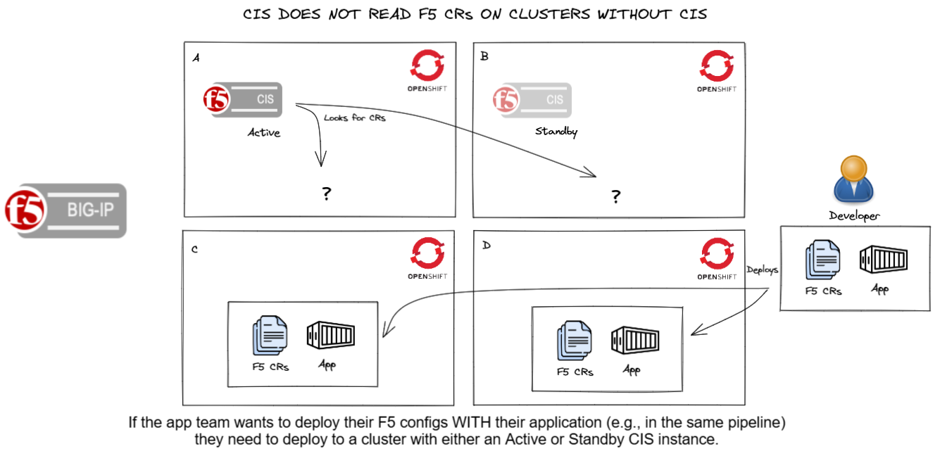 You may choose to install CIS on Cluster 1 and have CIS “watch” all 4 clusters for services to expose via BIG-IP. But before now, you had to install CR’s - VirtualServer and TransportServer - on Cluster 1 only. That means you have to control where your app teams deploy their resources.